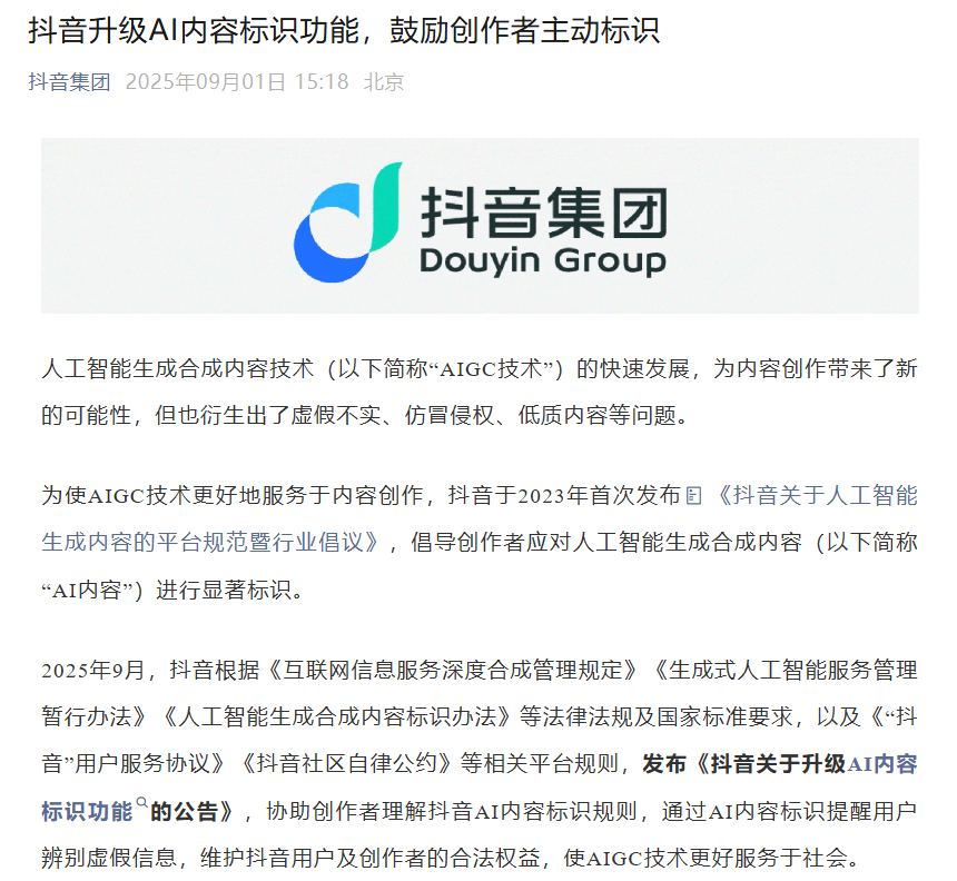 • 抖音集团发布《抖音关于升级 AI 内容标识功能的公告》