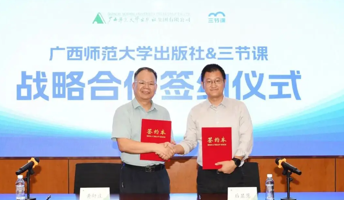 2025 年0 9月18日,在线学习平台“三节课”与广西师范大学出版社正式签署战略合作协议,双方启动“AI 时代人文素养大师课”项目。合作模式为“书课联动”:出版社提供优质图书版权和学术资源支持,三节课负责课程研发、数字化传播与平台运营。该项目将以视频课程、直播讲座、读书会等多元方式推出人文素养课程。