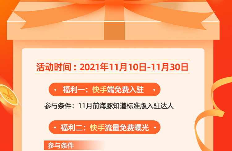 本次快手官方联合海豚知道官方共同举办的「双十一福利大放送」活动,上万流量免费曝光,助力达人高速变现。赶快参与活动,和小海豚一起为财富自由努力吧!