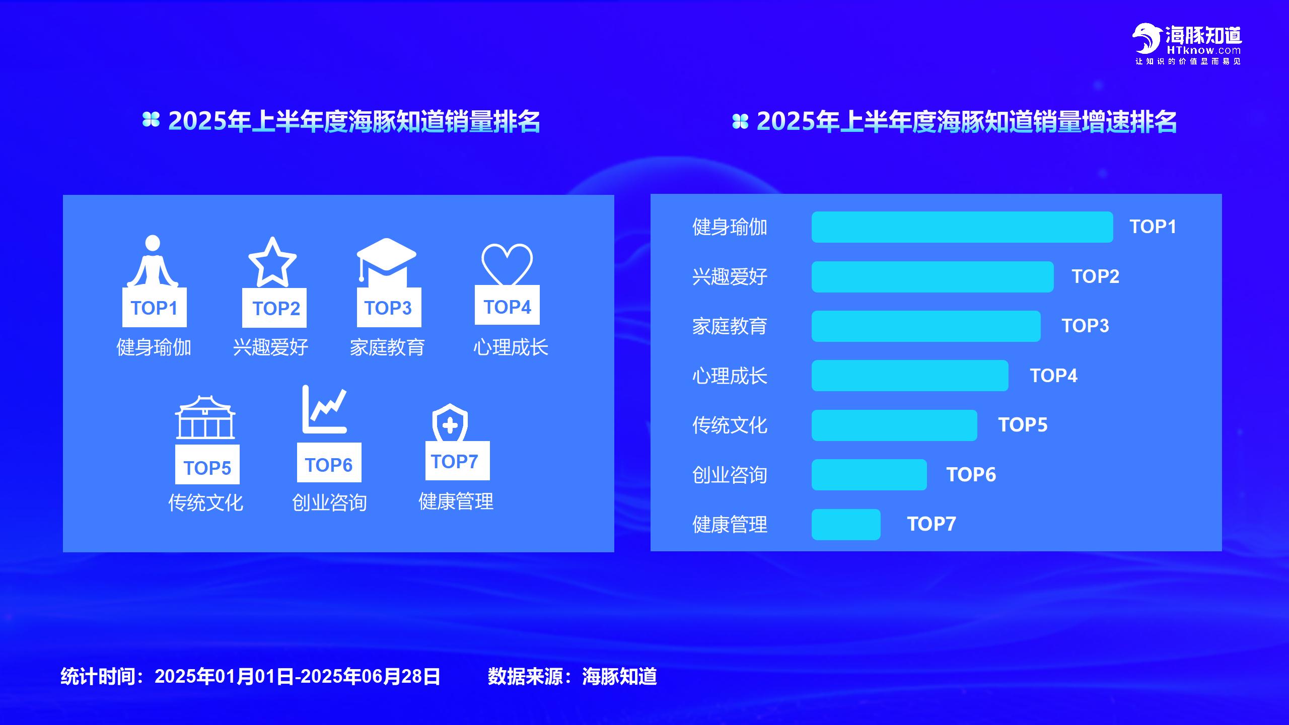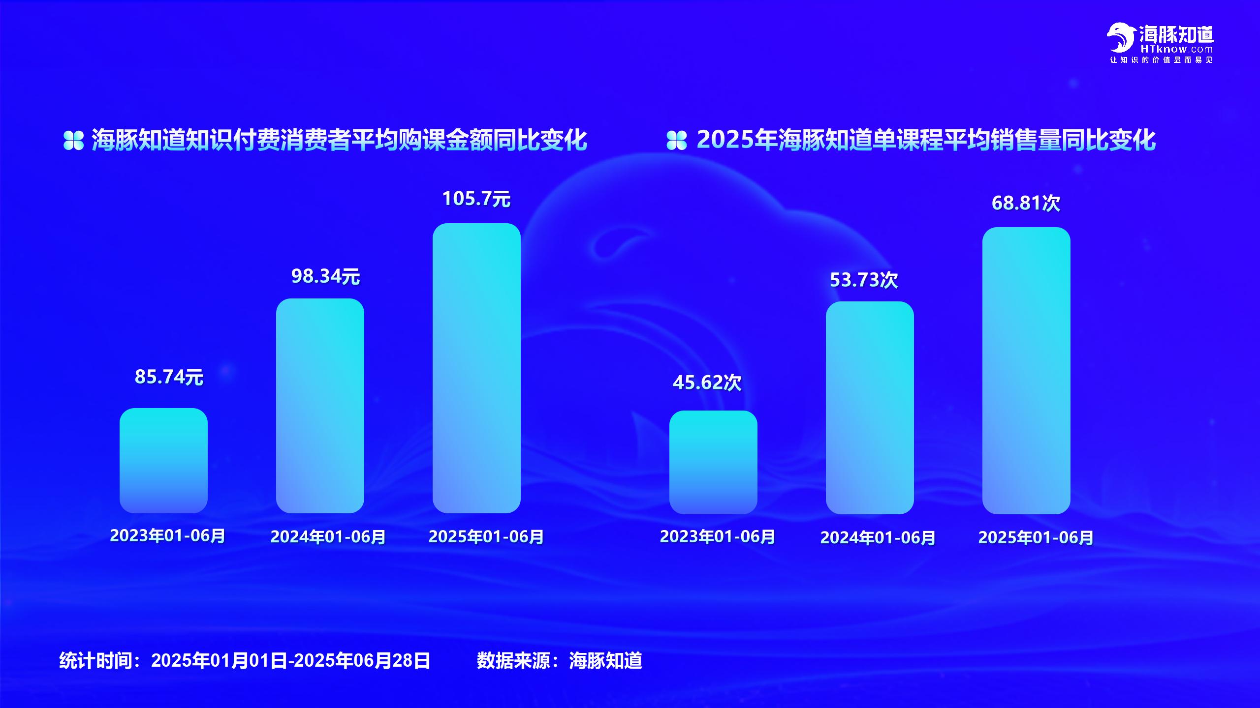 2025年上半年,海豚知道单一知识课程平均销量达68.81次,较2023年上涨超50%,平均购课金额三年间自85.74元升至105.7元,消费者自我提升需求与发展焦虑,叠加供给端的内容多元化以及公域平台的匹配算法,共同驱动着中国知识付费产业稳健增长。