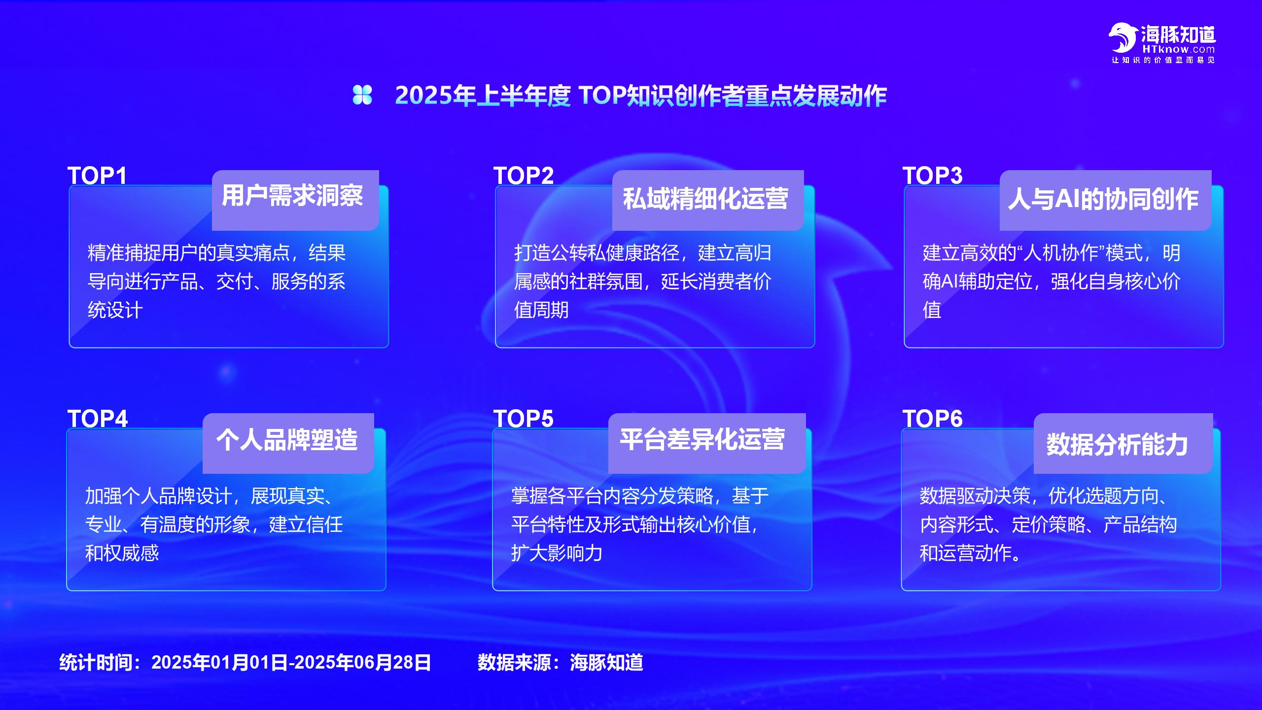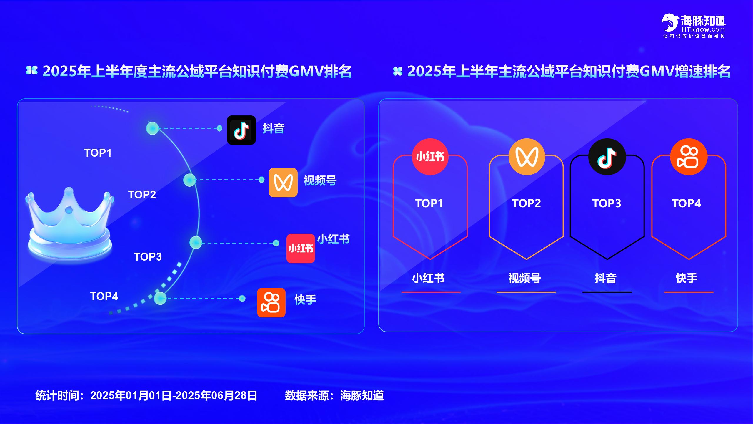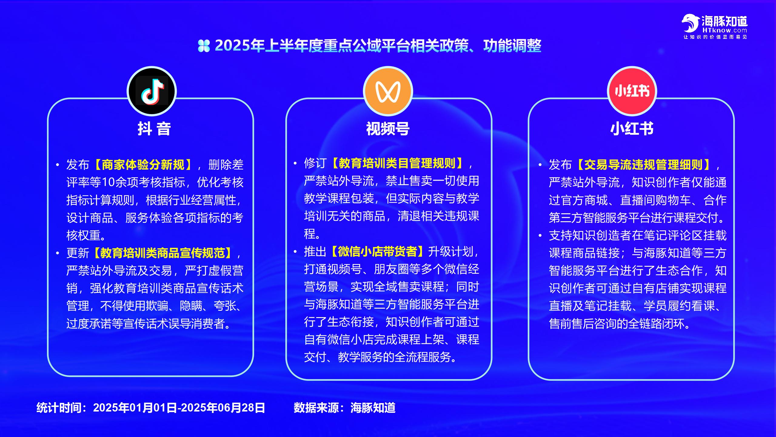 2025年上半年,抖音、视频号、小红书三大平台通过“强赋能+严监管”双轨策略重塑知识付费生态:监管侧以打击虚假营销、强化交易闭环及清退违规课程为支点,推动产业标准化建设;赋能侧依托规则体系优化、功能场景升级及与海豚知道等三方智能服务平台的生态融合,帮助知识创作者升级消费者转化漏斗,提升商业收益。