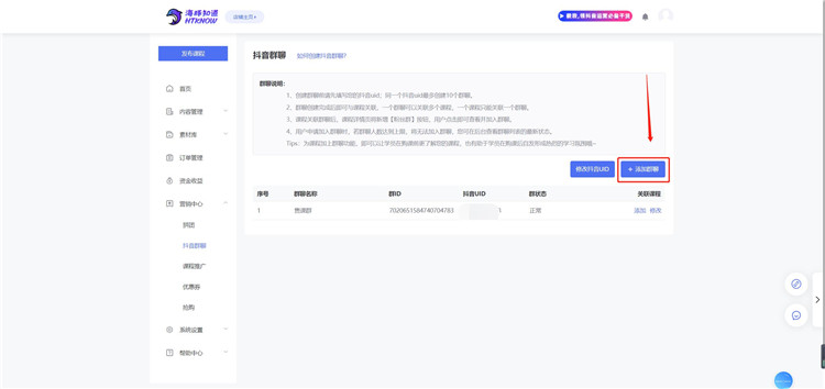 3、在【抖音群聊】页面,可对已创建好的群聊进行【添加】,即为群聊关联新的课程,一个群聊可以关联多节课程,一节课程只能关联一个群聊;