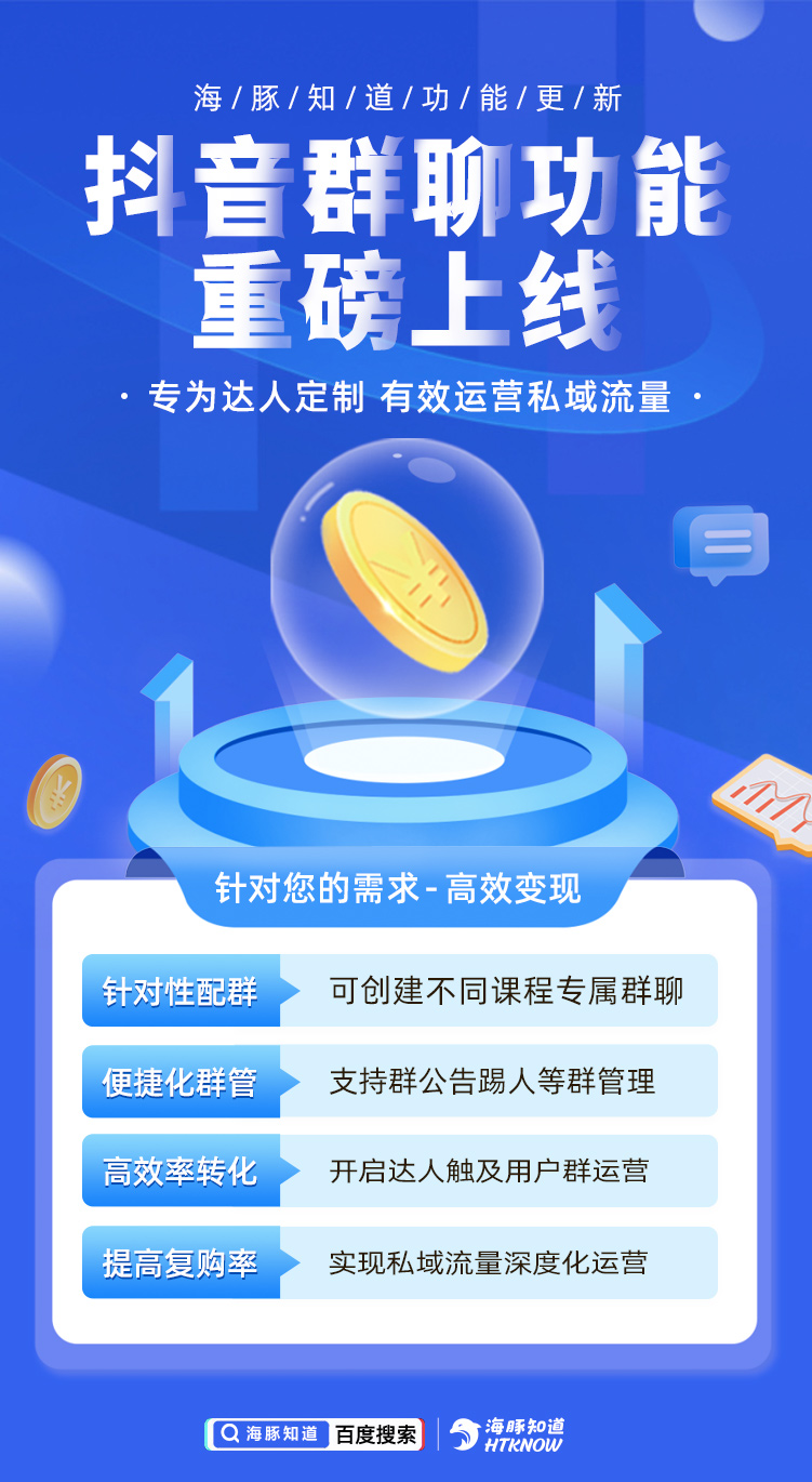 海豚知道达人后台→营销中心→抖音群聊→填写抖音UID→填写群聊信息→关联课程→保存→群聊已经创建完毕→抖音【消息】页面管理群聊
