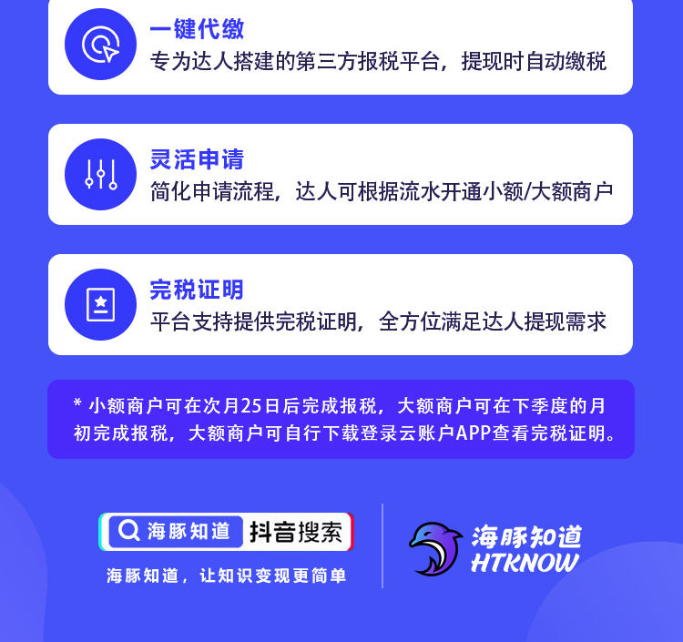 海豚知道【云账户代缴税务】功能重磅上线!达人无需单独报税,一键即可实现税务代缴,让你的缴税之路更加便捷。