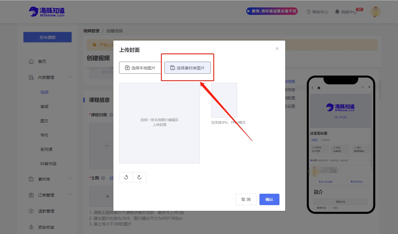 达人在设置课程参数时,可直接于海豚达人后台编辑课程主图、封面、详情页等场景需求图,海量优质设计模板随心选、零基础设计小白也能快速上手。